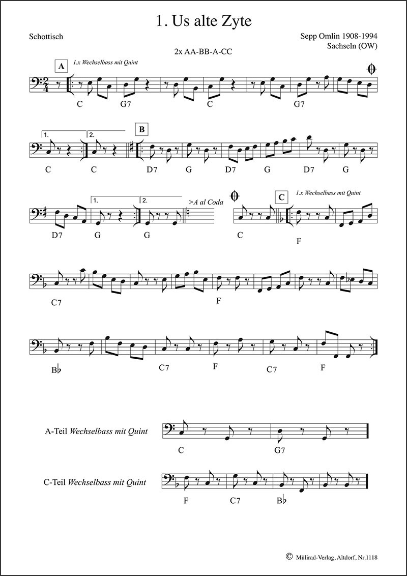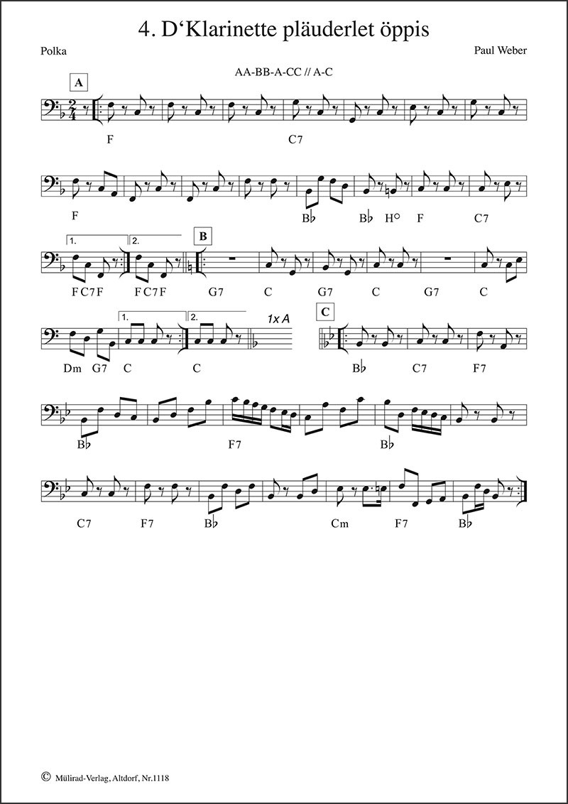 21 praktische Übungen zum Mitspielen Bassstimmen in traditionellen und persönlichen Facetten von Ueli Mooser Ergänzend zum Lehrmittel «DER KONTRABASS in der Schweizer Volksmusik» ist nun das vorliegende Spielheft entstanden. Mit Ueli Mooser, der schon seit Jahrzehnten das Kontrabassspiel in der Schweizer Volksmusik prägt, konnte einer der erfahrensten Kontrabassisten als Autor gewonnen werden. Grundkenntnisse werden für dieses Spielheft vorausgesetzt. Alle nötigen Angaben dazu werden im Lehrmittel «DER KONTRABASS» (Mülirad Nr. 1113) mit vielen Übungsbeispielen ausführlich beschrieben.