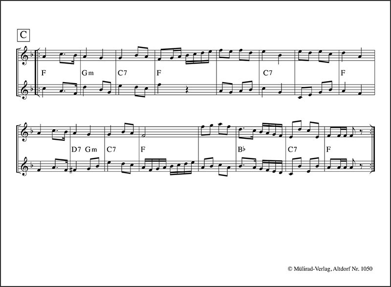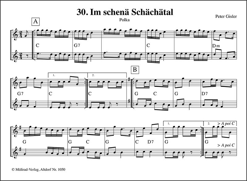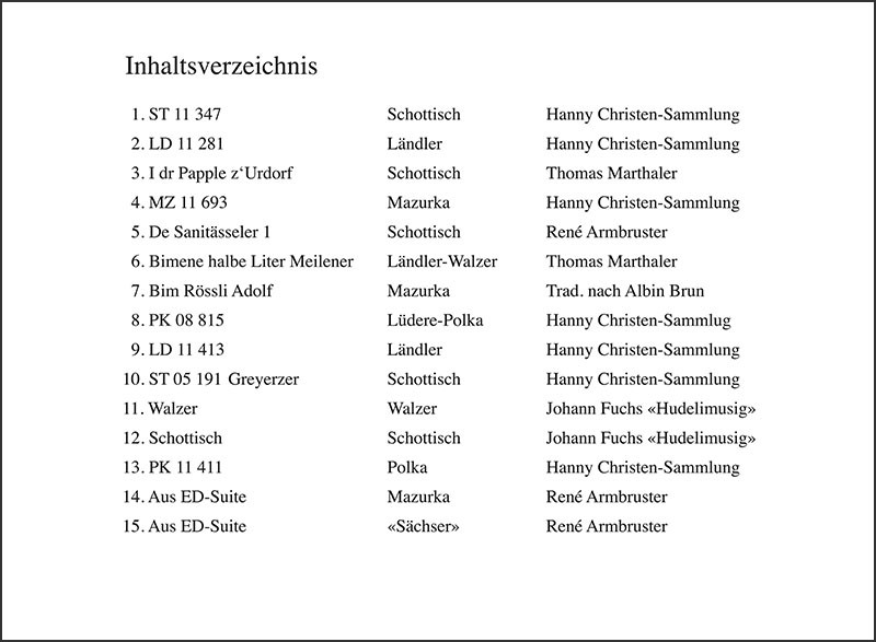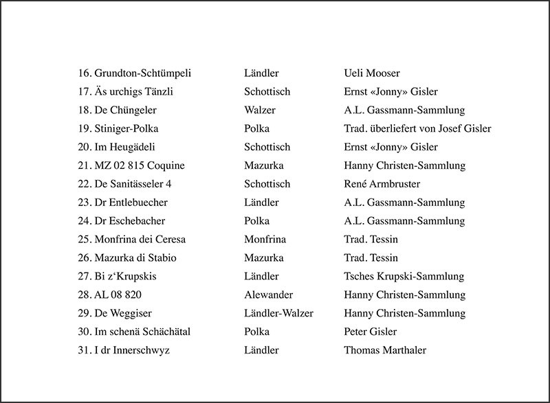 31 Tänze aus verschiedenen Schweizer Regionen 1- bis 3-stimmig mit Akkordangaben für div. Instrumente.