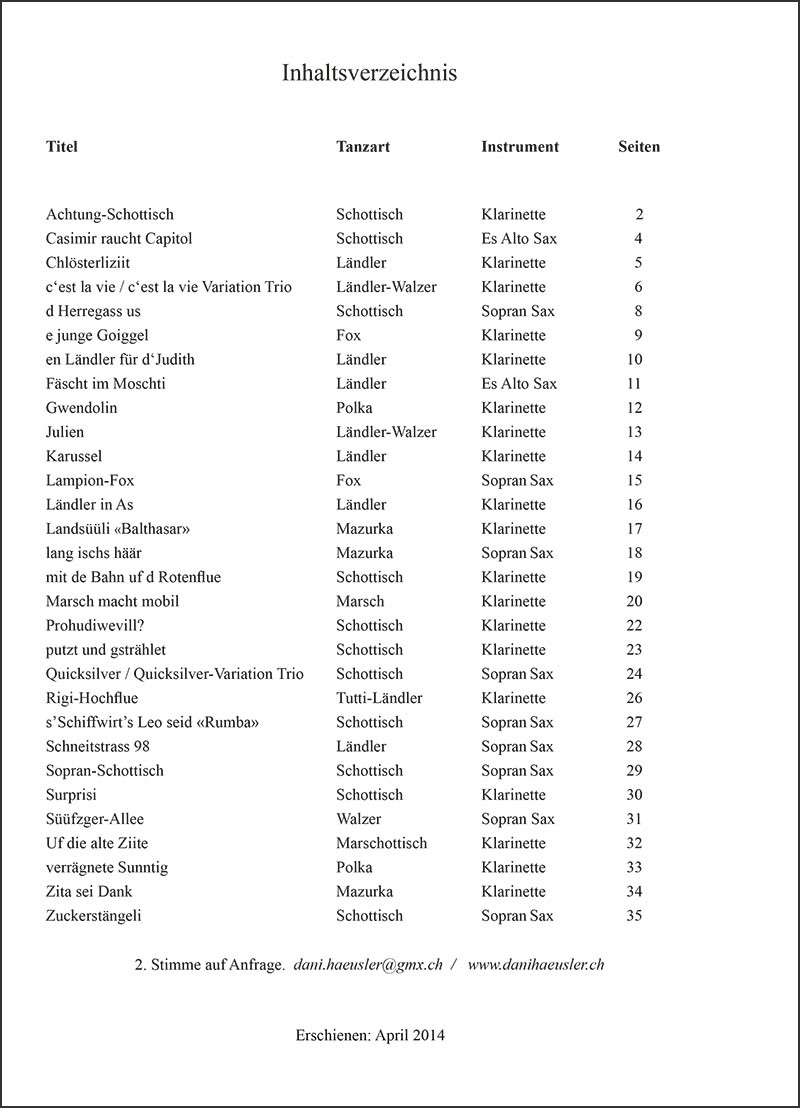 Dani Häusler, Klarinette, ist als Berufsmusiker hauptsächlich in und um die Schweizer Volksmusik aktiv. Als Interpret, Komponist und Arrangeur ist er u.a. in folgenden Formationen anzutreffen: Hujässler, Gupfbuebä, Hannelimusig oder Dani Häusler-Komplott. Er ist Bandleader der «SRF bi de Lüt-live»-Husmusig sowie Studienkoordinator Volksmusik an der Musikhochschule Luzern. Dani Häusler gilt als der virtuose Erneuerer der Schweizer Volksmusik. Alle Titel in dem Heft sind auf den Gupfbuebe CDs «Uf die alte Ziite» und «Mit de Bahn uf d‘Rotenflue» zu hören.