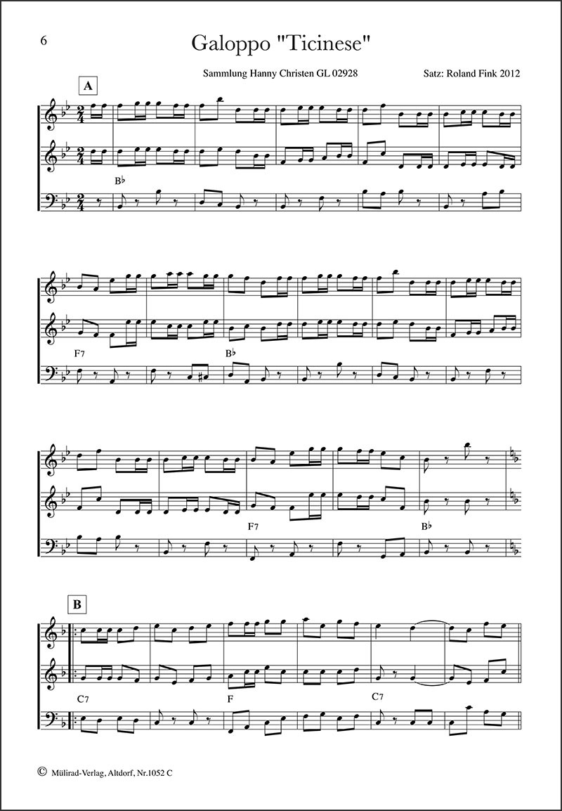 Schweizer Volksmusik aus dem 19. Jahrhundert, gesammelt von Hanny Christen. 3 oder 4-stimmig gesetzt von Roland Fink Violine, Blockflöte, Querflöte, Klarinette, Trompete, Akkordeon, Gitarre, Kontrabass, Tuba oder andere Instrumente mit Akkordangaben. Die vorliegenden Melodien sind eine Auswahl aus der Hanny-Christen Sammlung. Die Tänze hat Hanny Christen vermutlich am 16. Oktober 1952 von Angelo Trezzini in Astano erhalten. Wer diese Tänze gespielt hat und in welcher Besetzung wurde nicht vermerkt.