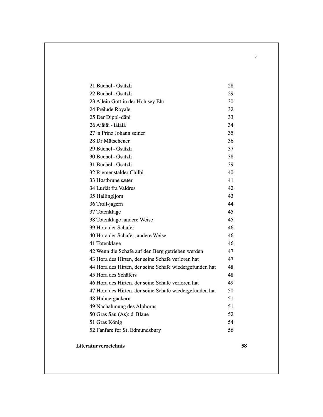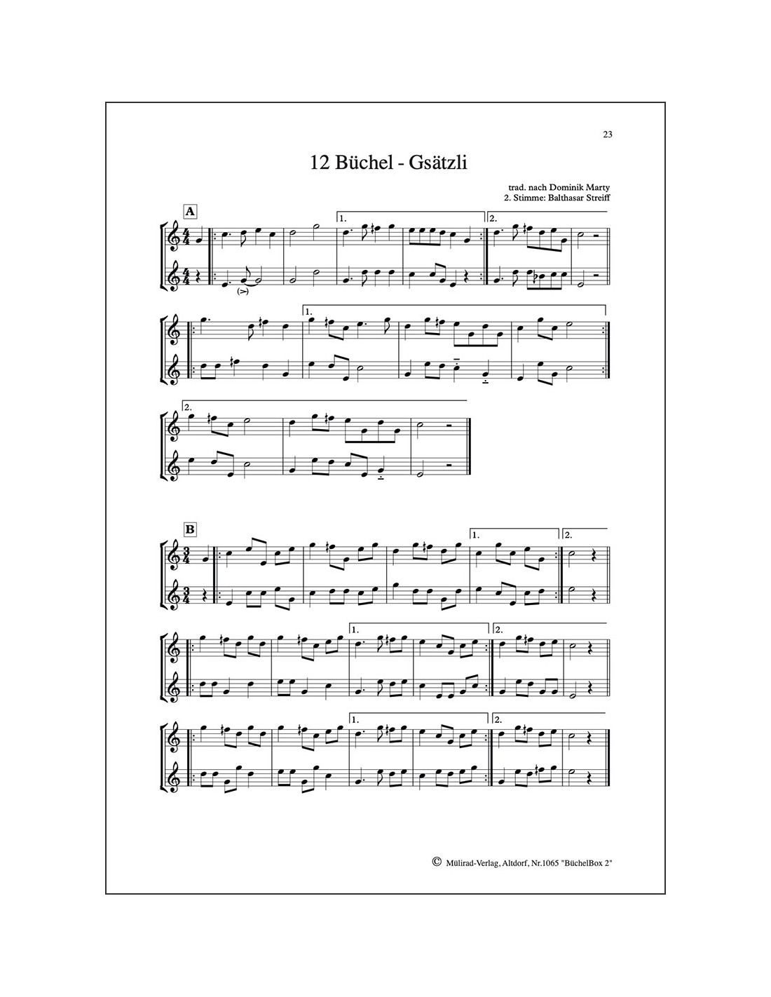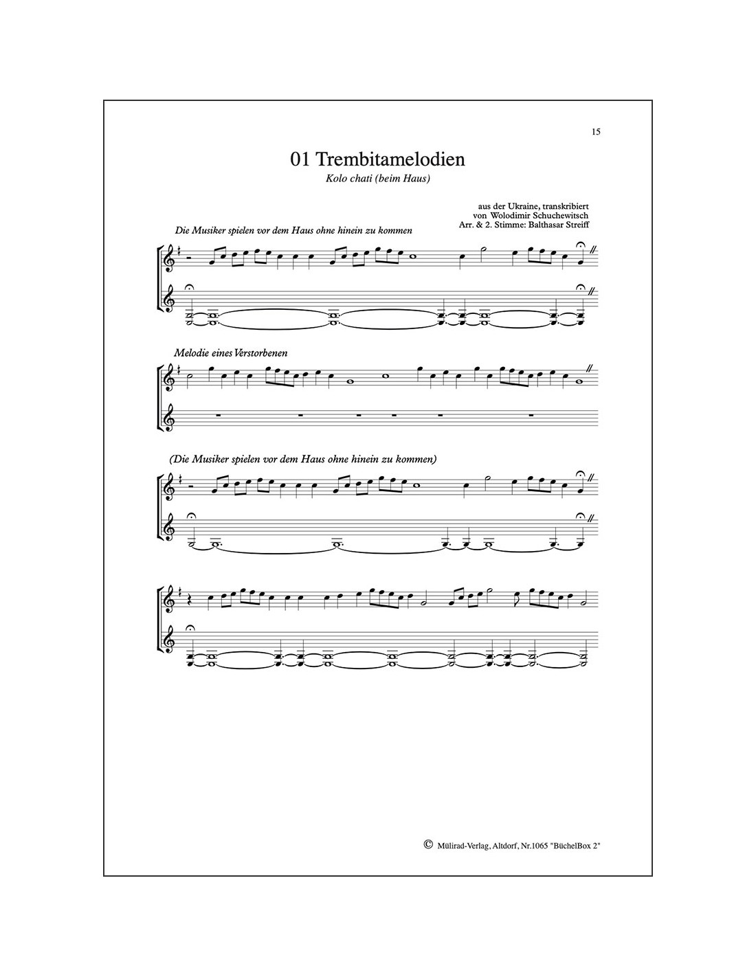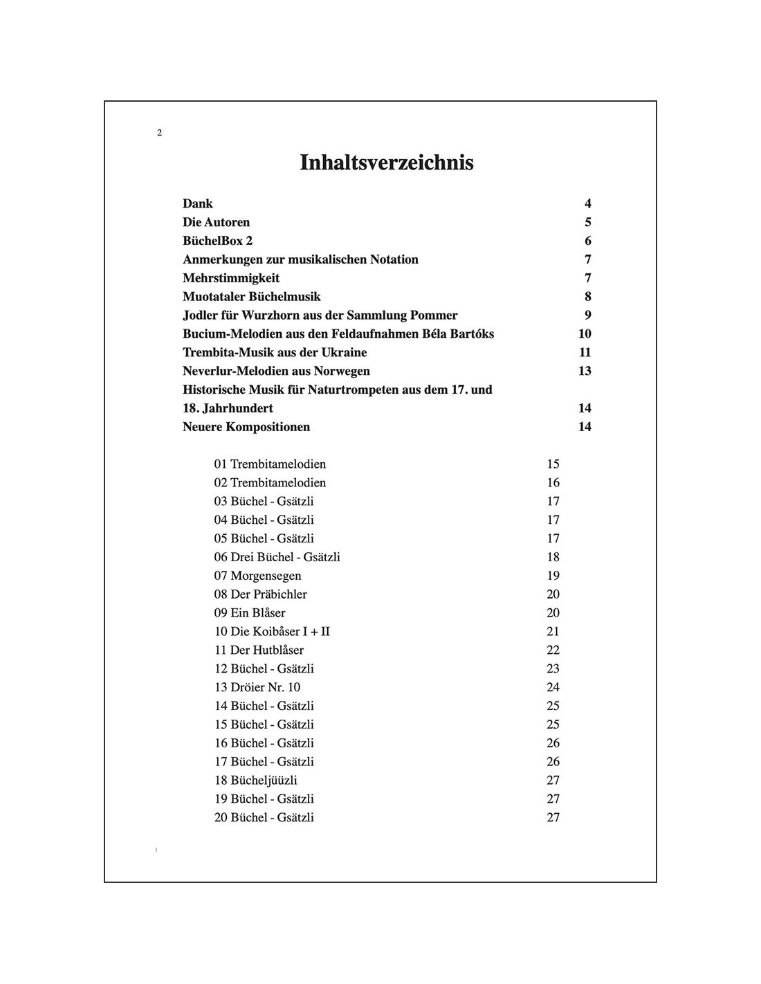 Mit dem hier vorliegenden Notenband BüchelBox 2 und der gleichnamigen CD versammeln wir eine umfangreiche Edition von ein- bis vierstimmigen Stücken für Büchel. Als Holztrompete, welche in verschiedenen Regionen der Schweiz seit rund 200 Jahren dokumentiert ist, steht der Büchel historisch dem Alphorn nahe. Allerdings geriet das Instrument in der zweiten Hälfte der 20. Jahrhunderts und im ersten Jahrzehnt des 21. Jahrhunderts beinahe in Vergessenheit. Während sich Musikerinnen und Musiker verschiedener Stilrichtungen dem Alphorn annahmen und dieses als Markenzeichen der alpinen Volksmusik etablierten, wurde dem Büchel keine vergleichbare Aufmerksamkeit zuteil. Recherchen in den vergangenen Jahren haben jedoch eine erstaunliche Vielfalt und Tiefe von Musik für Büchel zutage geführt, welche im Frühjahr 2020 auf der CD BüchelBox und im gleichnamigen Notenband präsentiert wurden. Reaktionen, Rückmeldungen und Hinweise von Interessierten sowie neue Erkenntnisse durch unser eigenes Weiterforschen resultierten im Repertoire für diese zweite Produktion. Die vorliegende Edition baut auf den Erfahrungen und Quellen aus der ersten BüchelBox auf und erweitert diese in verschiedene Richtungen. Darunter sind tradierte Stücke aus der Schweiz und aus Europa (Norwegen, Rumänien, Ukraine), historische Kompositionen, Bearbeitungen und neu komponierte Stücke, die über das bisher Bekannte hinausführen.