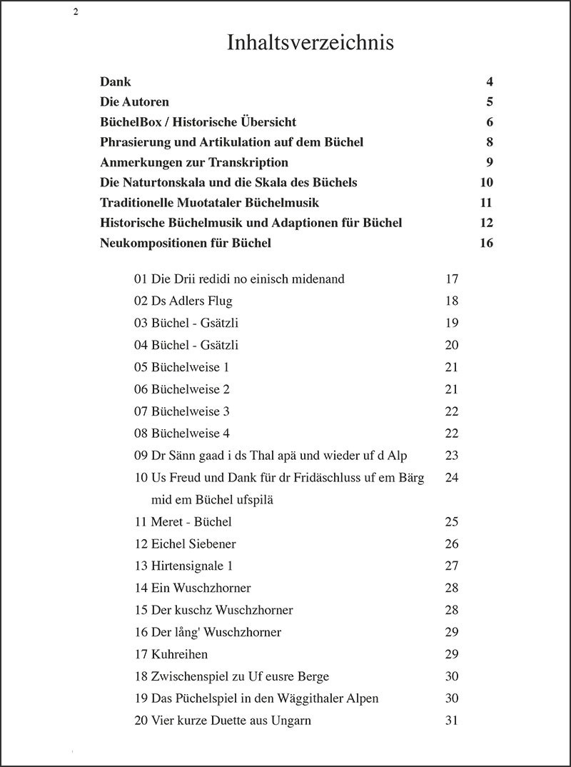 Initiiert wurde BüchelBox an einem Treffen auf Flüeli-Ranft, das durch das Forschungsprojekt «Musikalische Beziehung zwischen Alphorn und Jodel – Fakt oder Ideologie?» unter der Leitung von Raymond Ammann zustande kam. Aus diesen Forschungen stammte auch unser erstes Quellenmaterial zur Büchelmusik. Unverzichtbar ist das Wissen um die Muotataler Büchelmusik, das wir aus erster Hand erhalten haben – dafür danken wir Cécile Schmidig und Peter Betschart. Die Musik- wissenschaftlerin Anastasiia Mazurenko hat die Titel von Trembita-Stücken aus der Sammlung von Wolodimir Schuchewitsch aus dem Ukrainischen übersetzt. Pál Richter hat uns auf die Originalauf- nahmen der Buciumweisen Béla Bartóks im digitalen Bartók-System hingewiesen. Noten norwegischer Stücke für Neverlurar wurden uns dankenswerterweise von Jørn Simenstad zur Verfügung gestellt, Janine Gloor hat relevante Fragen zu norwegischen Schreibweisen beantwortet. Bei der Suche nach Jodelmelodien für Wurzhorn hat uns der Jodler Willi Mayer auf den Hutblåser-Jodler aufmerksam gemacht, weitere Quellen zur Wurzhornmusik verdanken wir der Musikwissenschaftlerin Eva Banholzer.