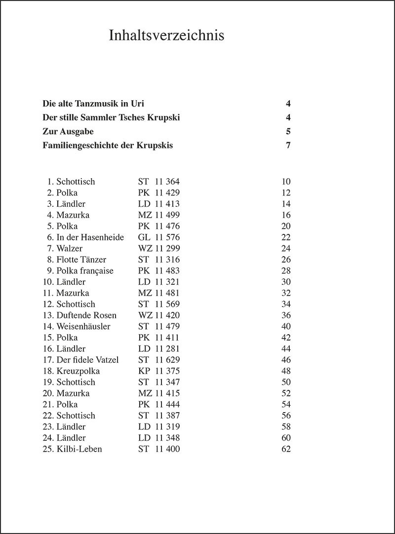 Tsches Krupski (1882-1940) gilt als der grösste Überlieferer alter Tanzmusik aus Uri. Rund 660 von über 900 Manuskripten sind in der Hanny Christen-Sammlung wiedergegeben. Das vorliegende Heft und CD beinhalten eine Auswahl von 25 unterschiedlicher Tänze aus dem Notenschatz des stillen Sammlers. 3 - 5 stimmig gesetzt für Klarinette, Trompete, Violine, Örgeli/Akkordon, Kontrabass oder andere Instrumente von Peter Gisler.