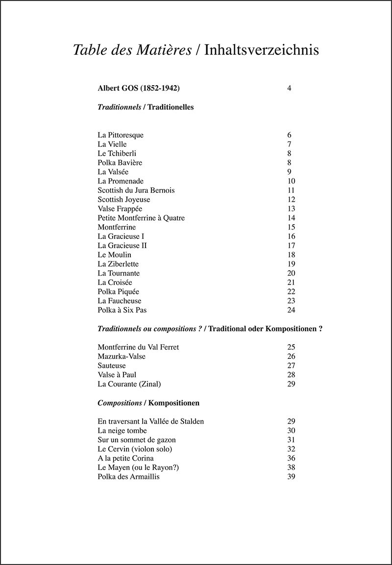 In der Volksmusik der Romandie stösst man immer wieder auf den Namen des Genfer Malers Albert Gos. Sein Leben lang hatte er drei Leidenschaften: die Berge, das Malen und die Musik. Er ging in die Berge um zu malen, nützte aber gleichzeitig die Gelegenheit mit den dortigen Musikanten zusammen zu spielen. Seine Violine hatte er bei seinen Exkursionen immer bei sich. Wenn er mit den Einheimischen zusammen spielte, schrieb er eine grosse Menge ihrer Tanzstücke auf, die sonst verloren gegangen wären. Die in diesem Notenheft enthaltene Melodie-Auswahl stammt aus dem Archiv der Familie Gos, aus Volkstanz-Sammlungen und aus einem Buch, das Albert Gos selber geschrieben hat. Die von Albert Gos selber geschriebenen Melodien sind so notengetreu wie möglich übertragen worden. Die Akkorde und die zweite Stimme sind von Fabian Müller und Nikita Pfister ergänzt worden.